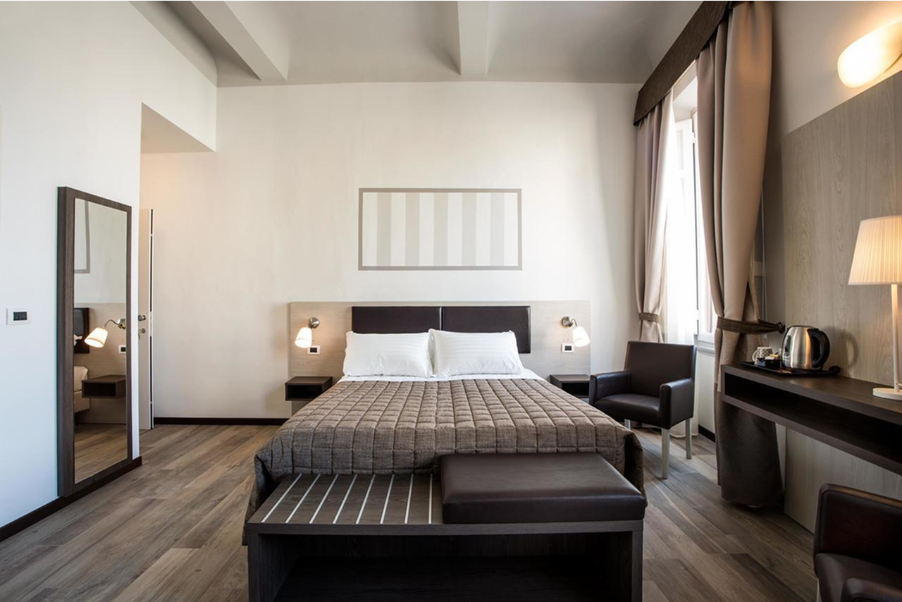 Camera tripla di 26 m² con 1 letto matrimoniale e un divano letto singolo, ideale per un soggiorno confortevole. La stanza è dotata di scrivania, zona soggiorno e armadio/guardaroba con grucce, ingresso indipendente e chiave elettronica. Al tuo arrivo troverai una colazione di benvenuto, disponibile solo il primo giorno del soggiorno.